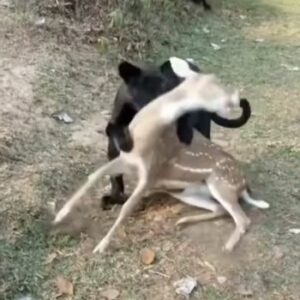 A dramatic wildlife scene has been captured showing two black panthers attacking a deer in what appears to be a powerful moment of nature’s raw survival instinct….
