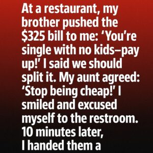 At a restaurant, my brother pushed the $325 bill to me: “You’re single with no kids—pay up!” I said we should split it. My aunt agreed, “Stop…