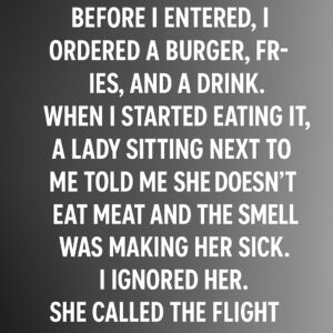 I have an 8-hour flight. Before I entered, I ordered a burger, fries, and a drink. When I started eating it, a lady sitting next to me…