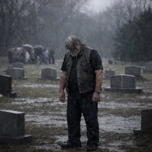 Inside the chapel, the world felt claustrophobic, heavy with the scent of lilies and the sound of muffled sobs. But through the tall, stained-glass windows, my eyes kept drifting to the parking lot. There, standing perfectly still in the downpour, was a man who looked like he belonged to a different world. He was massive, with a weathered gray beard and a heavy leather vest that glistened with rain. He didn’t seek shelter. He didn’t move. He stood with his head bowed, a solitary, soaking-wet monument of respect in the middle of the storm.
