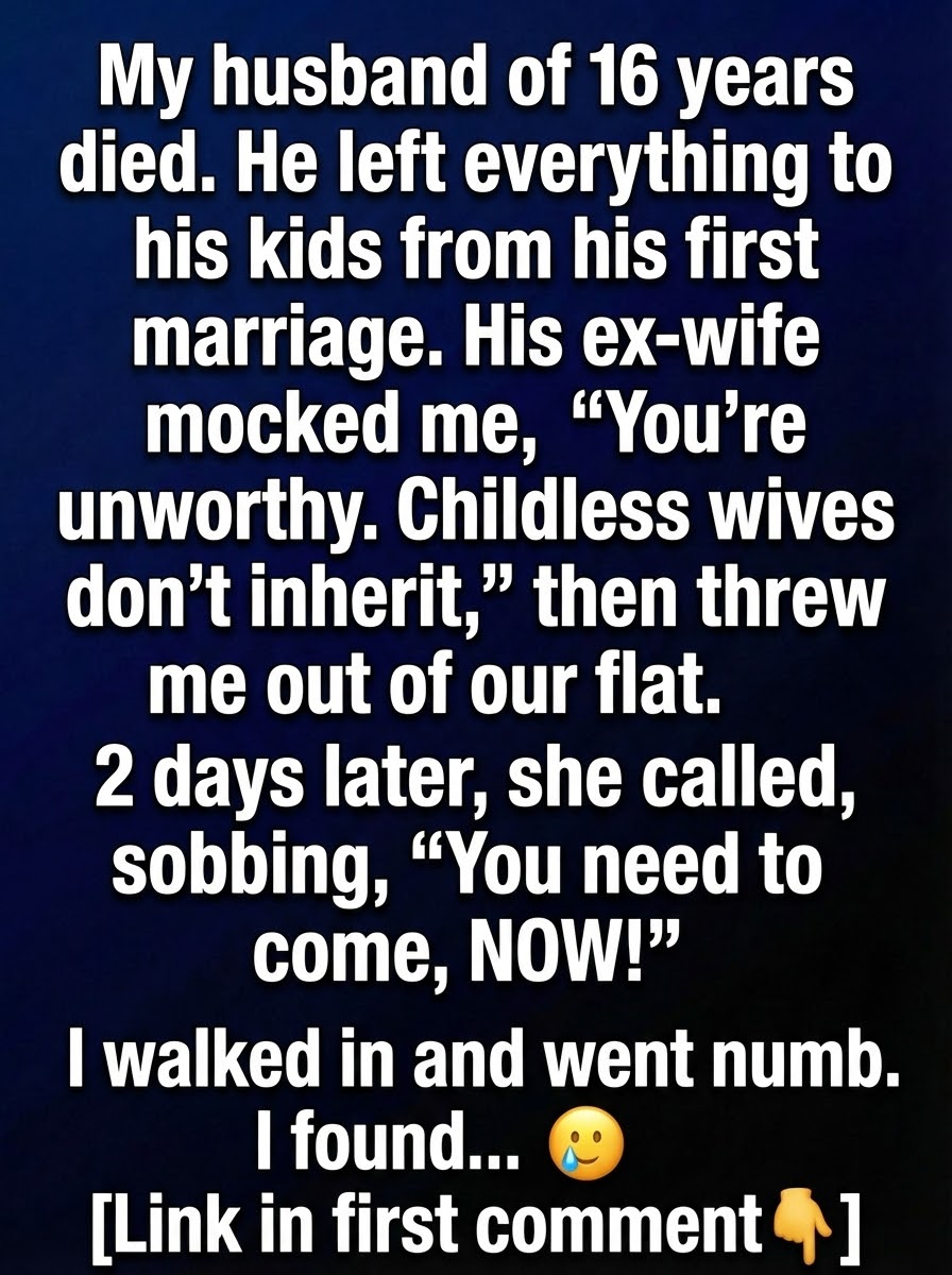 Marina had been married to Elias for sixteen years, years filled with quiet routines and shared dreams. When he passed away unexpectedly, grief hit her like a wave she could barely stand against. At the reading of the will, she sat still, hands folded tightly, expecting at least the home they had built together to remain hers. But the lawyer’s words were clear: everything had been left to Elias’s children from his first marriage. The room felt colder with each sentence. When she stepped outside afterward, his ex-wife, Nadine, stood waiting, her expression sharp as glass. “You were never meant to have anything,” Nadine said. “Childless wives don’t inherit.” Then, without hesitation, she told Marina to leave the flat immediately. In shock and exhaustion, Marina left with only a small suitcase and a heart too heavy to protest.