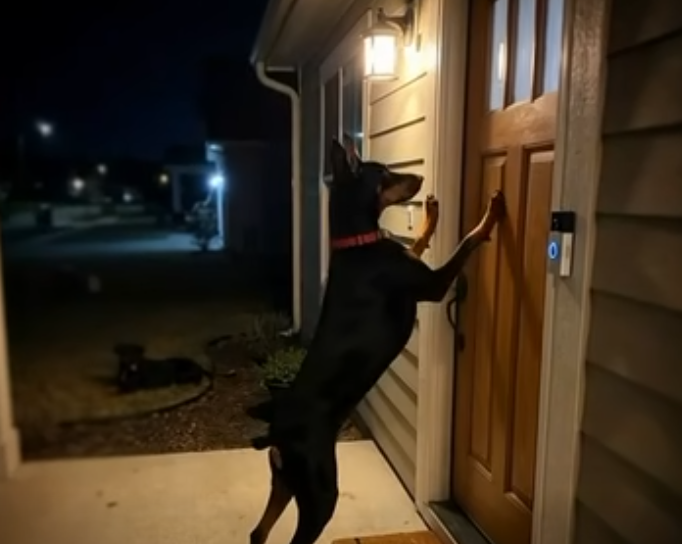 A Doberman stood on the doorstep, tense and trembling. Only a few meters away, lying on the concrete path, was a man — completely unconscious.
