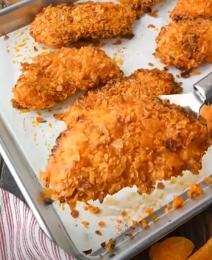 Press each chicken tender into the chip mixture, making sure it’s fully coated.Arrange coated tenders on the prepared baking sheet.