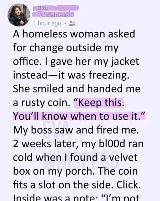 The firing felt like a public execution. One act of kindness, one cruel sentence, and my whole life shattered on the sidewalk. I walked away shivering, clutching a worthless, rusty coin from a stranger.I didn’t understand it until the box appeared—silent, heavy, waiting like a verdict on my doorstep. The coin slid in as if it had always belonged there, unlocking a truth I never saw coming: the woman I’d tried to help had been testing me the entire time. Not for a social experiment, not for a viral video, but for a life I didn’t even dare to imagine for myself.