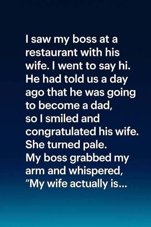 “I saw my boss at a restaurant with his wife. I went to say hi. He had told us a day ago that he was going to become a dad, so I smiled and congratulated his wife.”The words left my lips easily, almost cheerfully—but her reaction was immediate and sharp. She froze, her hand resting delicately on the table, the fork clattering against her plate. Color drained from her face, eyes widening as if caught between disbelief and unspoken sorrow.