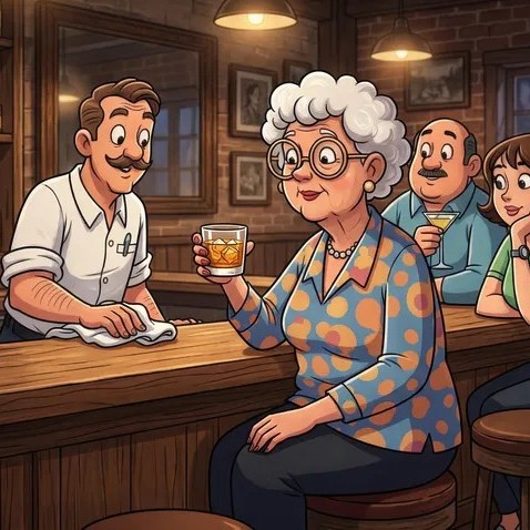 By the time the bartender served her third drink, his curiosity had grown too strong to ignore. Leaning closer with a friendly smile, he asked why she insisted on having only two drops of water in her Scotch every time. The woman chuckled, her eyes sparkling with humor, and answered in a playful tone that carried across the counter. She explained that at her age she had learned to enjoy life’s pleasures carefully — she could still appreciate a good drink, but if she added more water, she’d only end up making more trips back and forth, and tonight she preferred to stay put and enjoy the celebration.