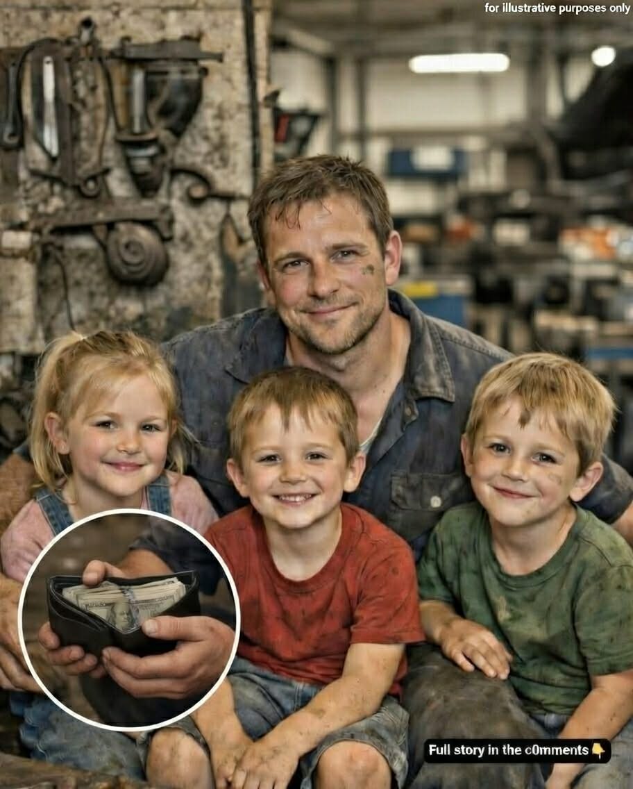 My name is Evan, a 36-year-old mechanic and single dad raising six-year-old triplets with the help of my 72-year-old mother. Their mom left when they were babies, and since then it’s been long days at a struggling repair shop and longer nights worrying about bills. Last Tuesday, after dealing with an angry customer, I found a wallet under a lift—stuffed with more cash than I’d seen in years. Rent was due, and the temptation was real.