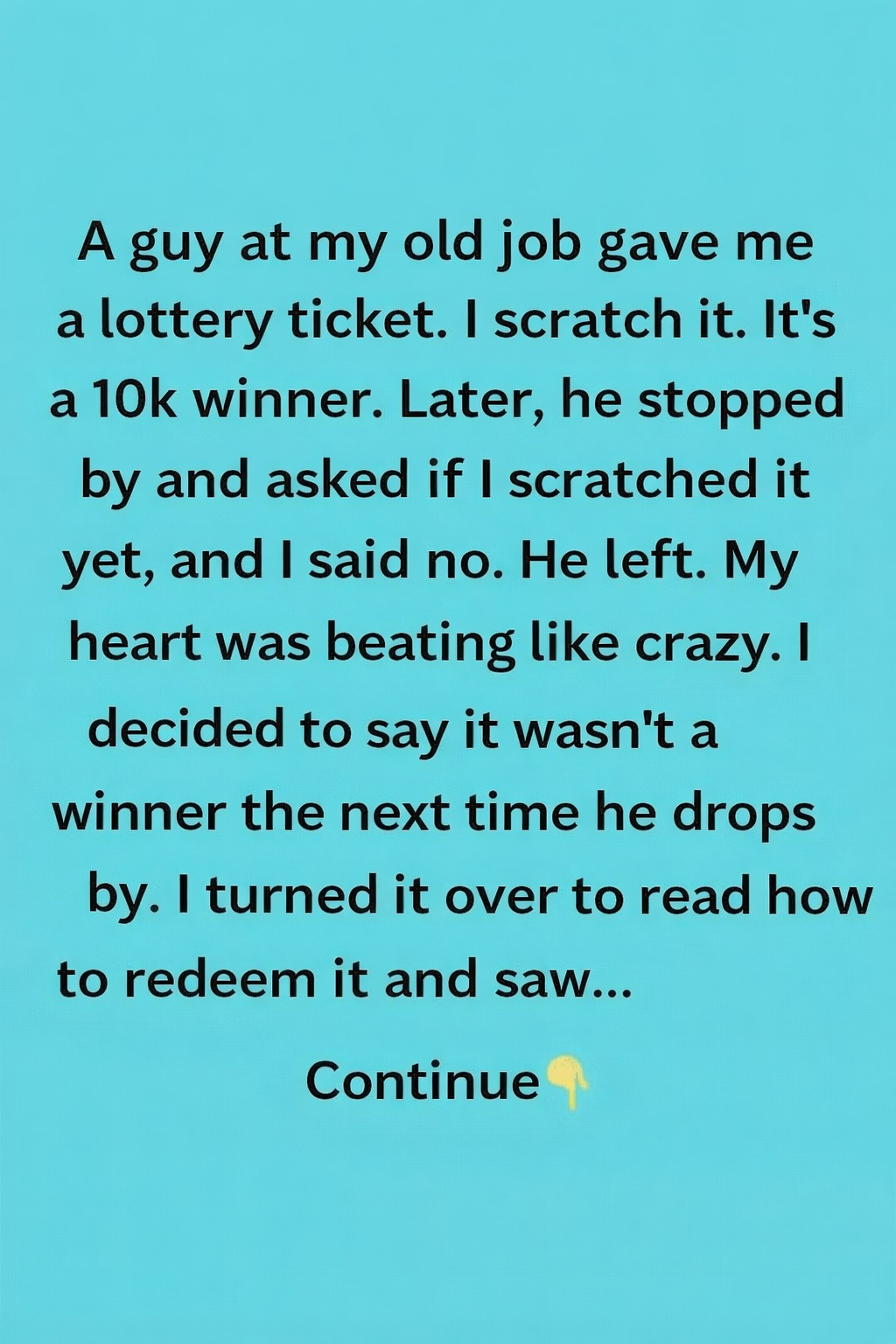 When I scratched the lottery ticket, my hands started shaking. Ten thousand dollars. I checked the numbers again and again, barely believing what I saw. The ticket had been a casual gift from a guy at my old job—nothing special, just a friendly gesture. I never imagined it would turn into something life-changing. Later that day, he stopped by and casually asked if I had scratched it yet.
