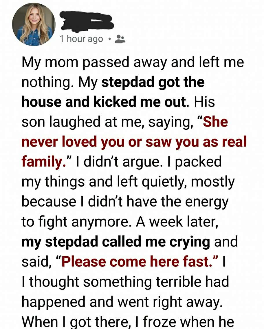 Then he pulled a folder from his bag and said he had discovered my mother’s legal will the night before. The documents, signed months before her unexpected passing, revealed that she had left the house to both of us and set aside a significant sum for my education. Tucked inside was a handwritten letter addressed only to me. In it, my mother called me the greatest gift of her life and urged me to stay strong and kind no matter what challenges I faced.
