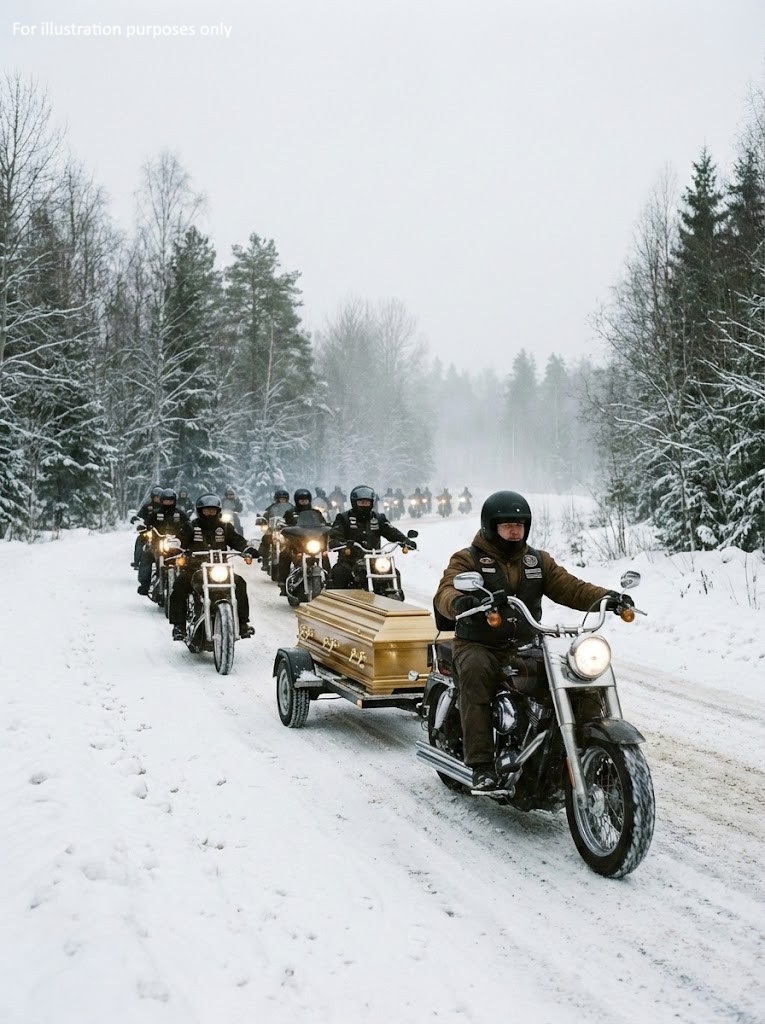 They reached Millfield at dawn on the third day, where the entire town stood waiting in the snow. Sarah embraced the weary riders before laying her son to rest on Christmas Eve beside his father. During the service, Big Jake placed Michael’s old leather vest atop the casket as the forty-seven motorcycles roared to life in a final salute. The thunder of engines echoed through the valley—a tribute of loyalty, sacrifice, and brotherhood. Inspired by their devotion, Sarah later learned to ride a motorcycle herself and founded a memorial fund to support other military families, ensuring her son’s legacy would continue to ride on.