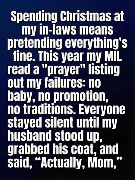 Every holiday season, visiting my in-laws came with an unspoken agreement: smile, nod, and keep everything pleasant no matter how tense it felt underneath. Christmas was especially challenging, wrapped in expectations I never seemed to meet. That year, the living room glowed with decorations and polite laughter, but I felt like I was walking on fragile glass. When my mother-in-law suggested we all pause for a “prayer,” I expected something brief and traditional. Instead, her words drifted into uncomfortable territory, touching on hopes for changes in people’s lives—careers advancing, families growing, traditions being “restored.” Each phrase landed heavier than the last, and I could feel the room growing still.