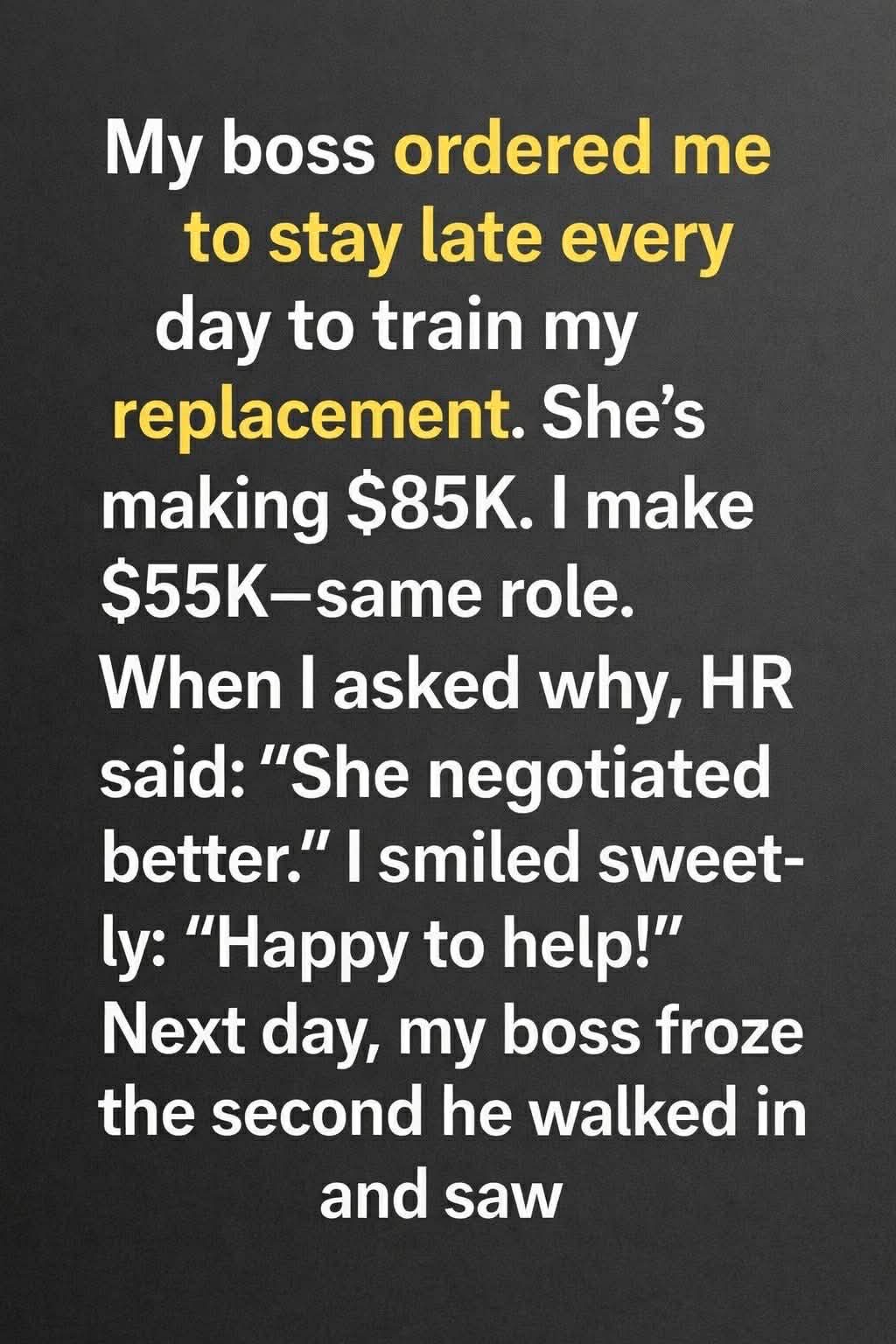 I knew something was wrong the moment my boss asked me to stay late all week to train the woman taking over my job. But nothing prepared me for what HR told me: she’d be making $85,000 while I’d been earning $55,000 for the exact same role. When I asked why, HR simply said, “She negotiated better.” Something in me shifted. Instead of arguing, I smiled and agreed to train her. The next day, my boss walked in to find two neatly labeled stacks on the desk: “Official Job Duties” and “Tasks Performed Voluntarily.”