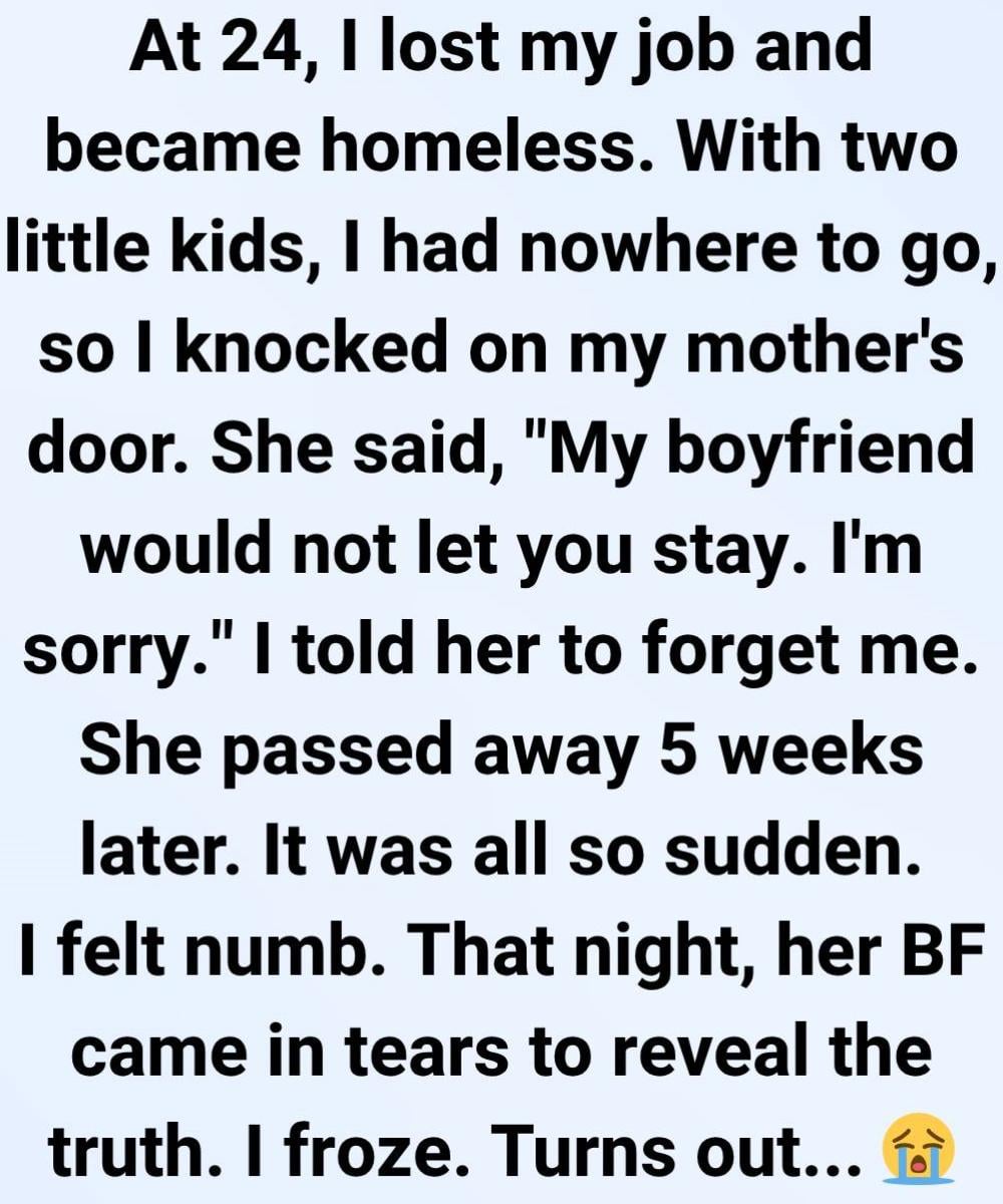 At twenty-four, after losing my job and home, I found myself sleeping in my car with my two young children. Desperate, I went to my mother for help and told her everything—the layoff, the eviction, the nights spent under streetlights. She hesitated and said her boyfriend wouldn’t allow us to move in. Heartbroken, I walked away and ignored her calls and messages in the weeks that followed.