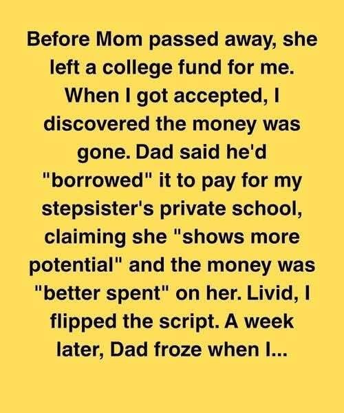 Before my mom passed away, she left a college fund in my name. The day I got accepted, I found out it was gone. My dad had “borrowed” it to pay for my stepsister’s private school, saying she showed more potential and the money was better spent on her. A week later, I told him I was dropping out and moving out. That part wasn’t fully true—but I needed him to believe I was done asking for anything.