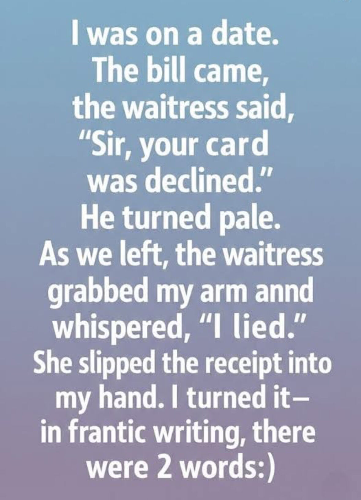 The cool night air did little to calm the warmth spreading across my face. I worried about what my date might be thinking, how quickly a good impression could disintegrate. Just as I was trying to gather my thoughts, the restaurant door opened, and the server called my name. She approached quietly, touched my arm, and whispered, “I lied.” She handed me a folded receipt and walked back inside. Still confused, I opened it. The bill was marked as paid, with no signature from me, just confirmation that someone had covered the cost. The server had staged the declined-card moment to protect my dignity, while allowing the act of kindness to remain anonymous.