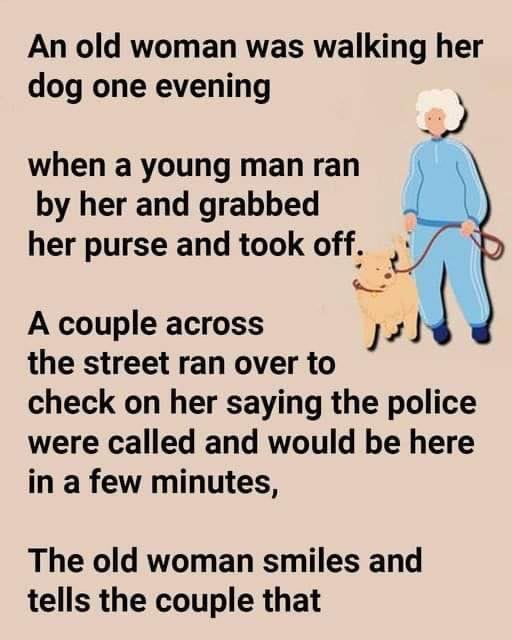 One evening, an elderly woman was walking her dog when a young man suddenly ran past, snatched her purse, and bolted. A nearby couple rushed over, assuring her the police were on their way. To their surprise, she calmly smiled and said it wasn’t a big loss—she used that old purse to carry her dog’s waste until she got home. The real shock, she joked, would be the thief’s when he opened it.