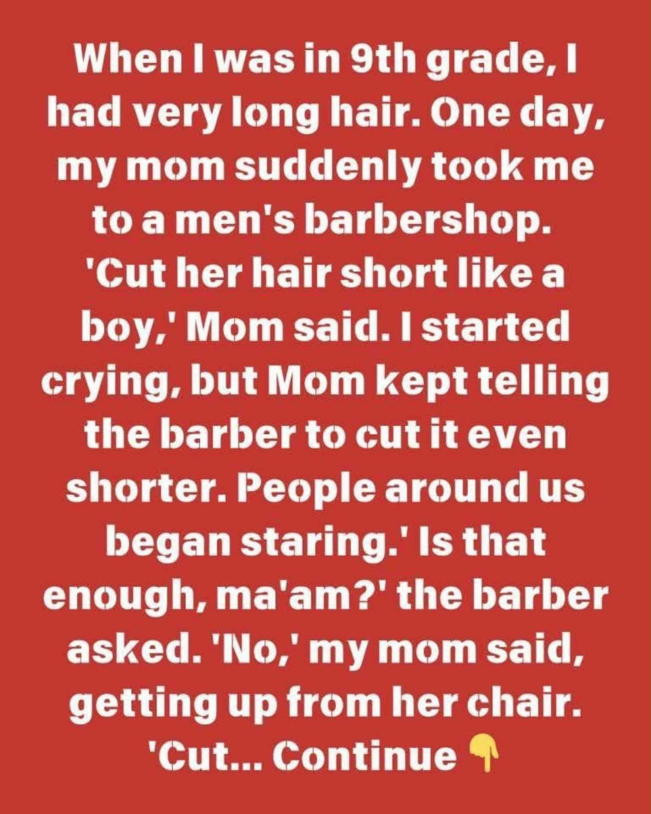 One unforgettable story comes from ninth grade, when a girl with long hair was unexpectedly taken to the barbershop by her mother. To her horror, her mom instructed the barber to cut it short—above her ears, “like a boy.” She cried as her hair fell, while curious onlookers stared.