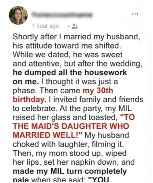 On my thirtieth birthday, I tried to reclaim a piece of joy by hosting a dinner with family and friends. But Patricia stood to give a toast that froze the room: “To Sarah, the maid’s daughter who married well.” My husband laughed and even filmed it. Before I could react, my mother rose calmly to her feet and revealed the truth—she was not a maid, but the owner of several successful restaurants. She had planned to gift us all a luxury yacht cruise and lavish vacation, but after witnessing the disrespect, she reserved the celebration for me alone. Then she looked directly at my husband and said, “You don’t deserve my daughter—and you won’t touch a penny of her wealth when she leaves you.”