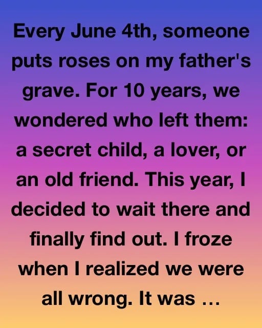 Every June 4th, someone left a rose on my father’s grave. For ten years, we wondered who it could be. This year, I decided to wait and find out. I watched as a man I’d never seen before approached, placed a white rose on the grave, and softly read from a small notebook, his voice trembling with emotion.