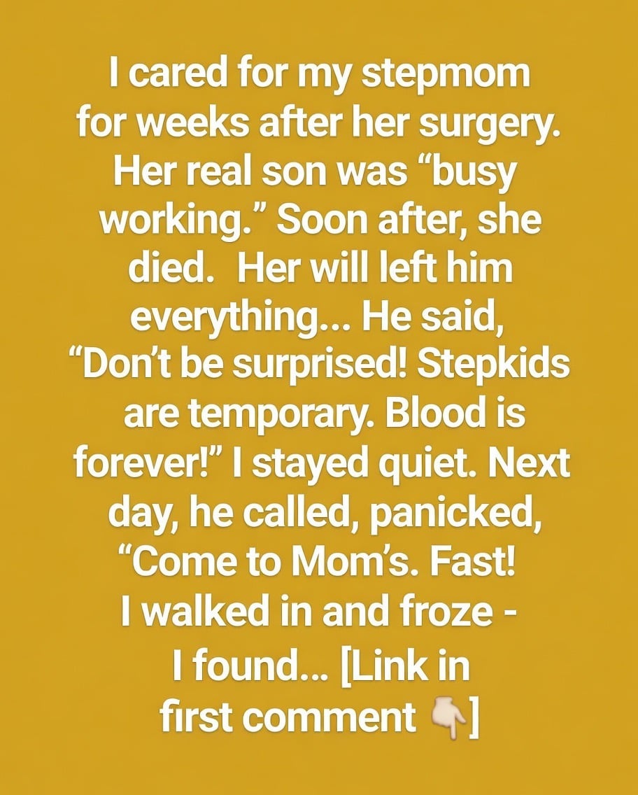 I spent weeks caring for my stepmom after her surgery while her son claimed he was too busy with work. I cooked, helped her walk, and stayed by her side through the pain. When she passed, her will left everything to him. He smirked and said, “Don’t be surprised. Stepkids are temporary. Blood is forever.” I said nothing, already carrying enough grief.