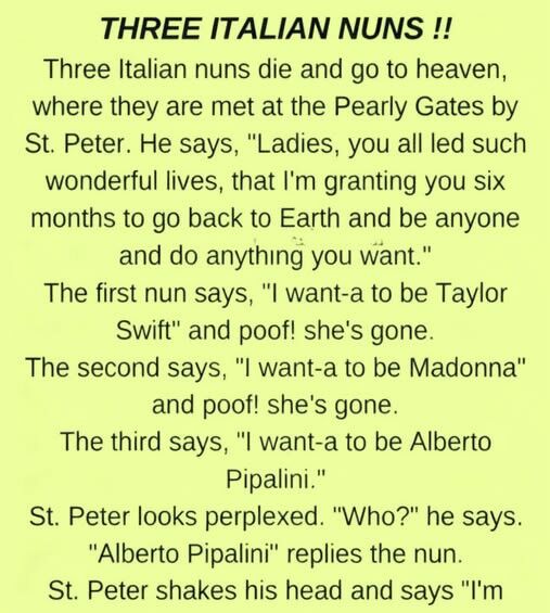 igh above the clouds, where everything shone with calm and order, three Italian nuns arrived together at the Pearly Gates after lives devoted to faith and kindness. St. Peter welcomed them warmly, checked their names, and shared surprising news: as a special reward, they would each receive six months back on Earth—free to be anyone they wished and do anything purely for fun. After lifetimes of discipline and devotion, the idea felt almost unreal. Their faces brightened with excitement at the unexpected gift.
