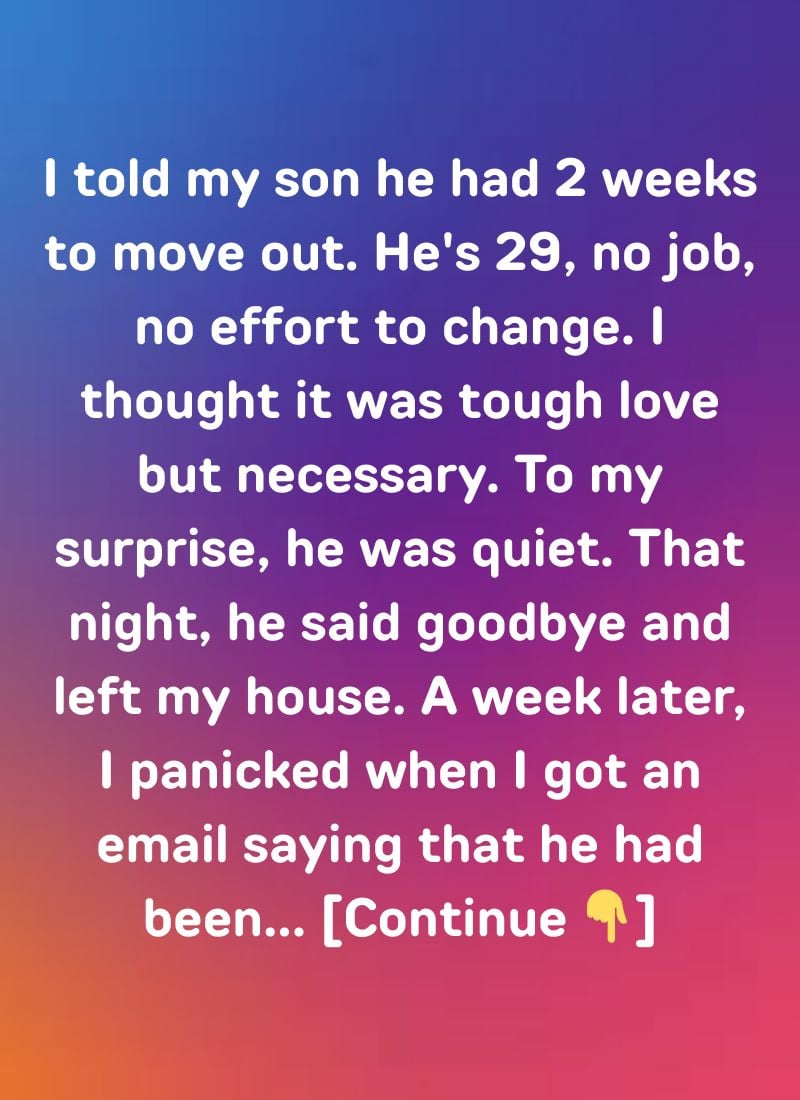 After years of supporting my 29-year-old son Daniel—paying his bills, stocking his fridge, and watching him drift without direction—I finally told him he had two weeks to move out. I called it tough love. Instead of arguing, he quietly packed a backpack and