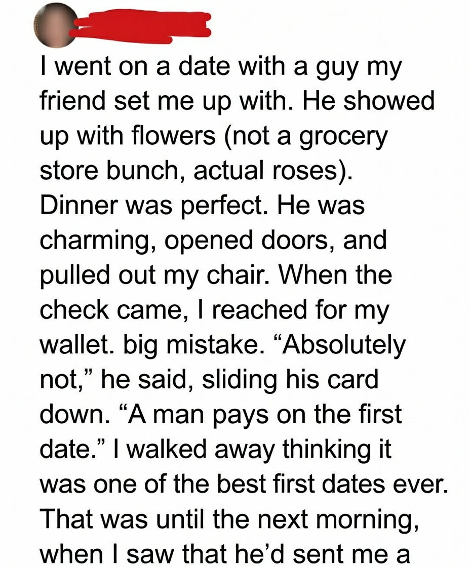 When Eric demanded to pay for our first date, I thought I’d met a true nobleman. Roses, a sweet gift, appealing conversation — he was examining all the boxes. When he texted me the next day, I predicted a cute follow-up, but my stomach lowered when I read his message.