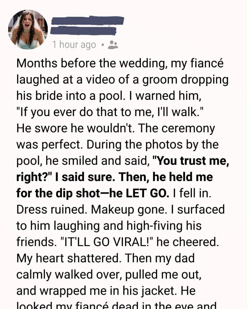 On our wedding day, everything felt perfect—until the photographer asked for a dip by the pool. Smiling, he whispered, “You trust me, right?” Then he let go. I fell into the water, my dress dragging me down, while he and his friends laughed and called it legendary.