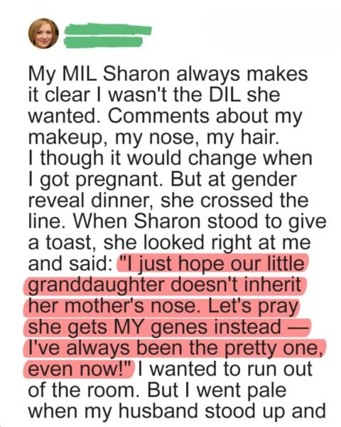 From the start of her marriage to Jake, Sharon made it clear her daughter-in-law wasn’t good enough, masking insults about her appearance as “concern.” When pregnancy brought sudden attention and a promised “small” gender reveal dinner, hope briefly replaced doubt—until the expectant mother walked into a crowded house of 25 guests and a staged spectacle. During her toast, Sharon mocked her pregnant daughter-in-law’s looks, joking about the baby inheriting her nose, drawing laughter from the room.