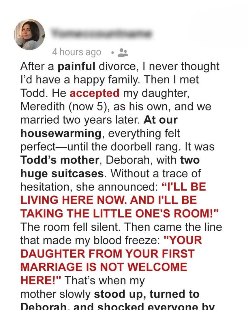 Todd’s mother, Deborah, stood outside with two enormous suitcases. Without asking permission, she walked in and announced she was moving in permanently—and would be taking Meredith’s bedroom. Then she looked directly at me and coldly declared that my daughter from my first marriage was not welcome in “her son’s home.” The room fell silent. Meredith clung to me, trembling and in tears, while shock and anger battled inside my chest.
