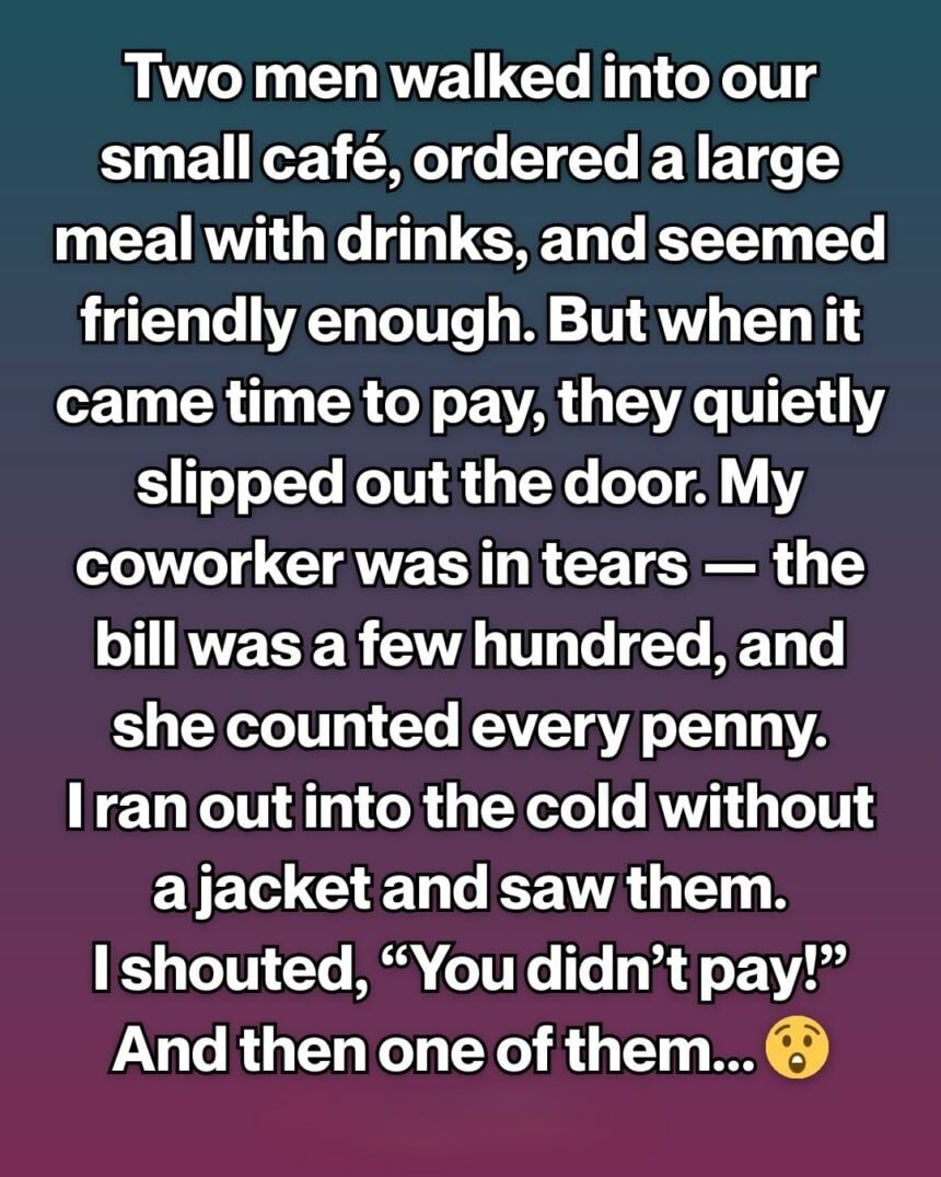 Two Men Skipped the Bill at Our Café—I Chased Them Into the Cold and Learned a Truth I’ll Never Forget