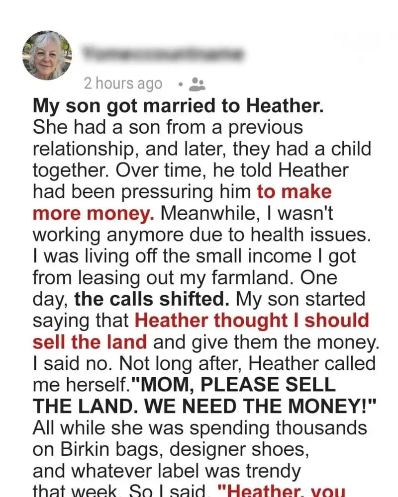 But cracks began to appear. Heather started pressuring Matt, claiming he wasn’t ambitious enough and comparing him to wealthier men. Casual comments escalated into demands, and soon she wanted the farmland Matt had inherited—the very land that had funded his education and secured my retirement. She promised spa days, luxury handbags, and vacations if we just sold it. I couldn’t let that happen. That land wasn’t just property; it was history, memory, and legacy. I said no, and Heather’s demeanor shifted from sweet wife to relentless manipulator.