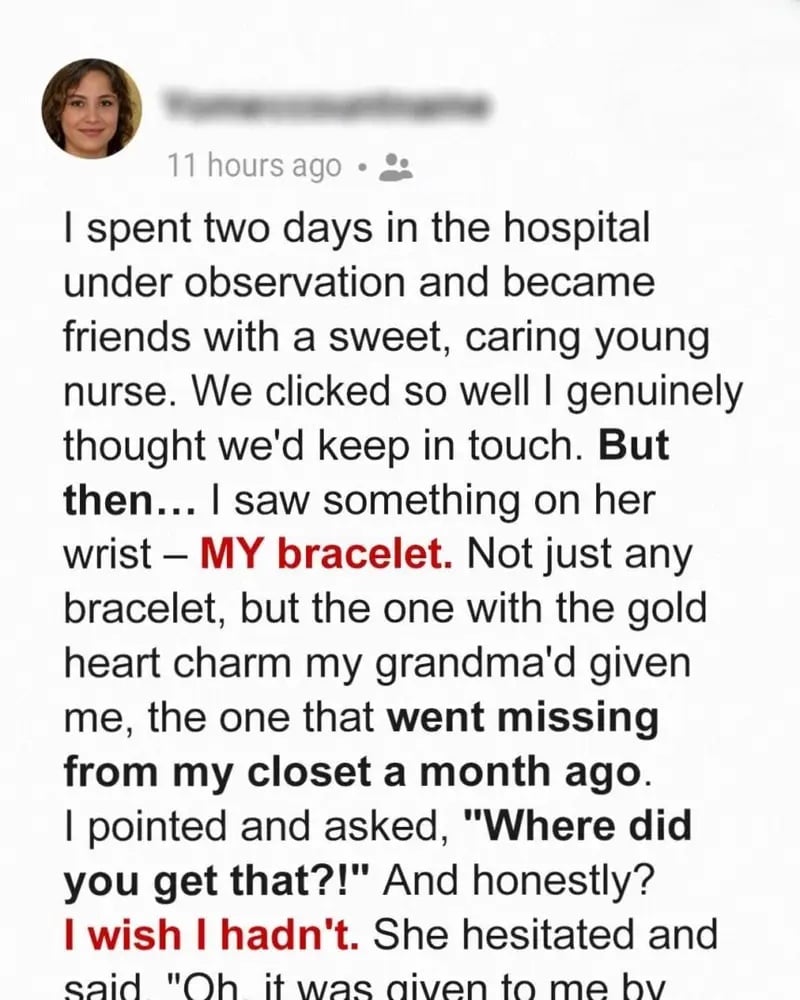 The moment I spotted the delicate gold bracelet on Nurse Stephanie’s wrist, my heart stopped. It was my grandmother’s gift, engraved with the tiny smiley face I had searched for endlessly before accepting it was gone. Seeing it glint under the harsh hospital lights felt unreal, like time had folded in on itself. My chest tightened as I asked Stephanie about it, and she smiled, mentioning her boyfriend had given it to her just a month ago—the same month the bracelet disappeared from my home.