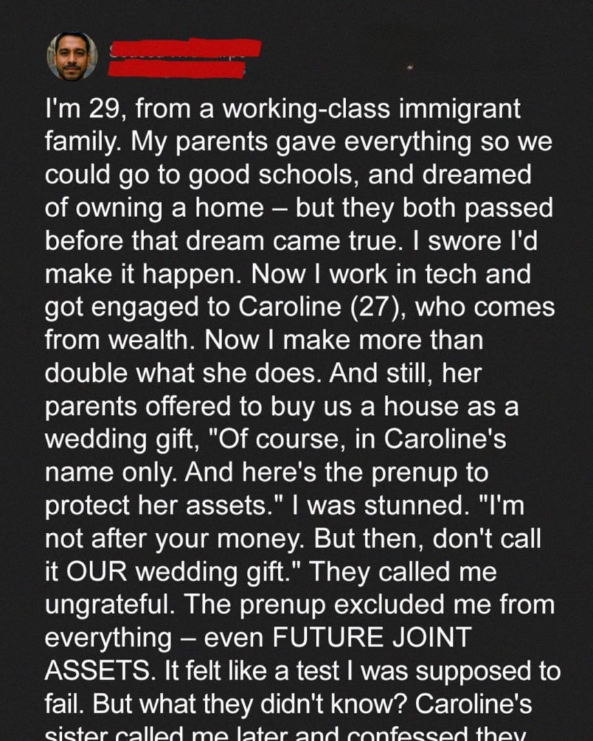 When her parents offered to buy us a house as a wedding gift, I was touched — until I heard the conditions. The deed would only be in her name, and a prenup would ensure I had no claim. It wasn’t a gift — it was control, dressed as generosity.
