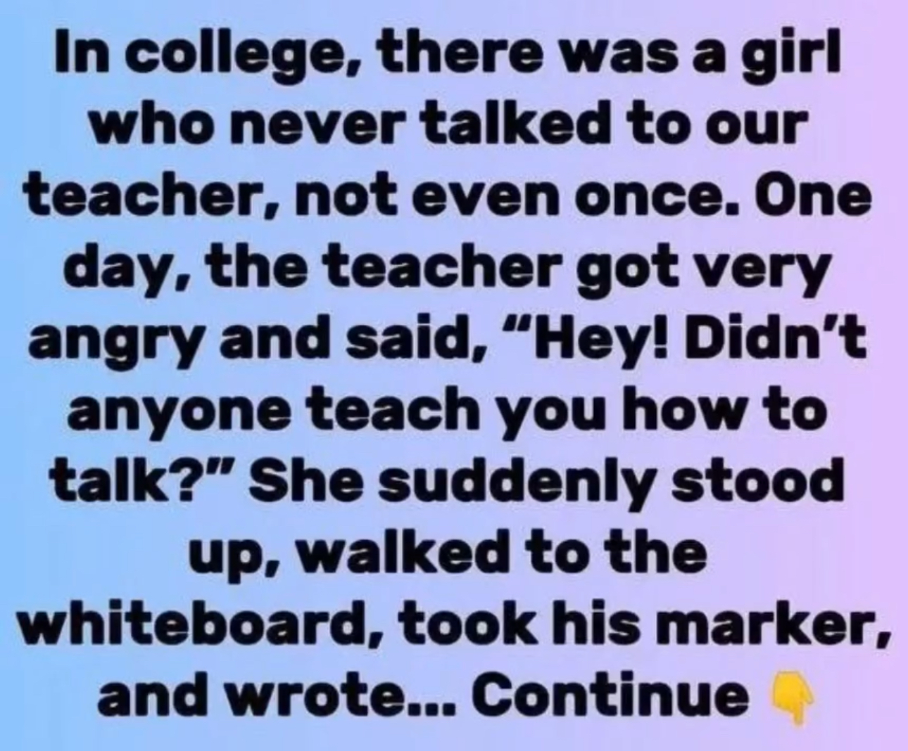 This happened during my first semester of college two years ago. There was a girl in my class who never talked to the teacher. He would ask her questions, but she stayed silent. I can’t remember her making any noise at all.One day, the teacher got very angry. He thought she was ignoring him and being rude, so he shouted, “Hey!Didn’t anyone teach you how to speak?” She stood up, walked to the whiteboard, took his marker, and wrote, “I am mute, you fool.