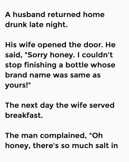 A husband came home late one night, clearly drunk. When his wife opened the door, he apologized and said he couldn’t stop finishing a bottle of alcohol whose brand name was the same as hers. The next morning at breakfast, he complained that the food was too salty. His wife calmly replied that she couldn’t stop adding salt because the salt brand had the same name as him.