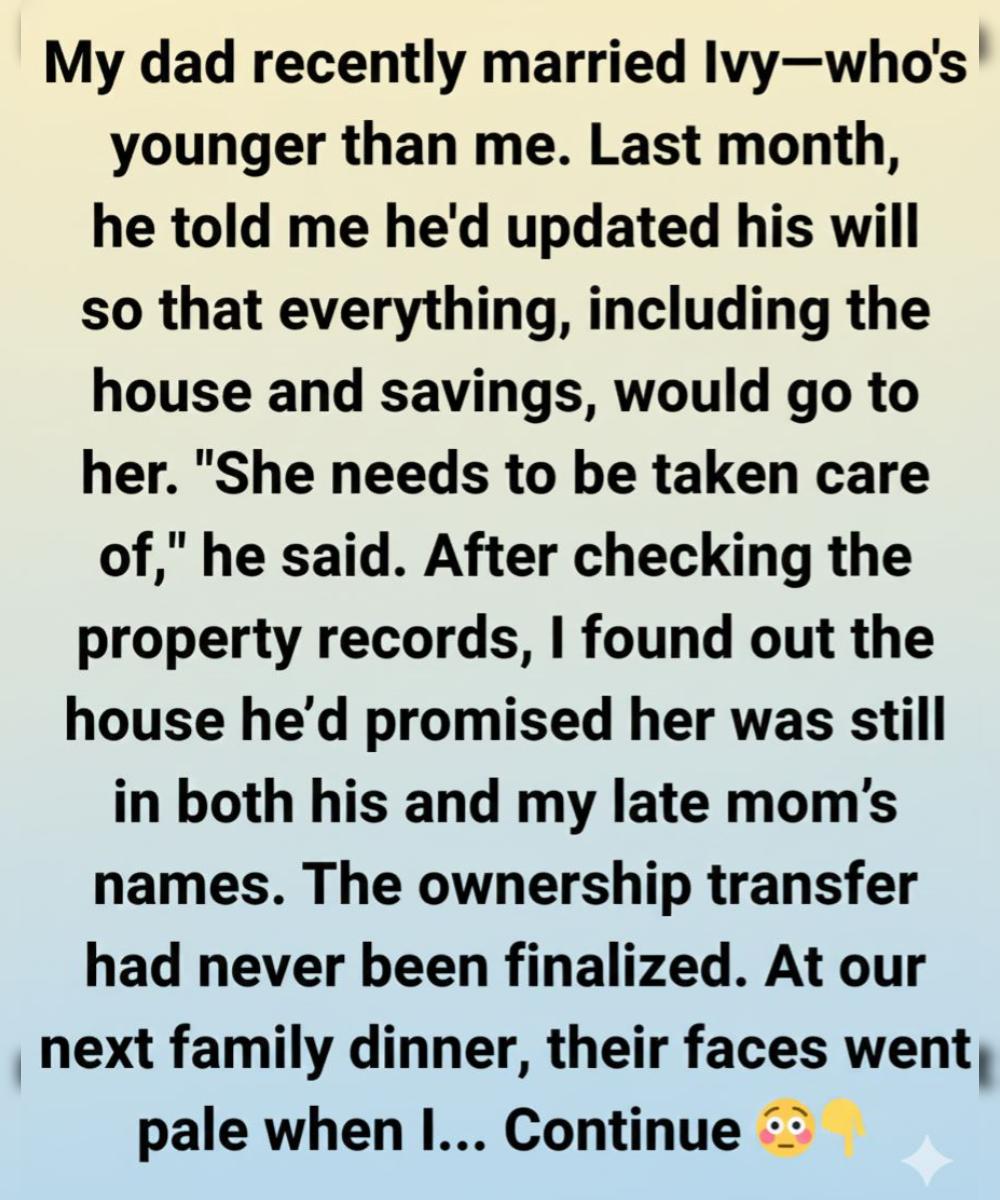 At the next family dinner, I calmly explained the situation: the house wasn’t entirely his to leave behind. The moment the words left my mouth, the room went silent. Ivy’s confident expression vanished, and my father looked stunned and angry. He accused me of going behind his back, while I reminded him I was simply protecting my mother’s legacy. Since then, things between us have been tense. He calls me selfish and claims I’ve threatened Ivy’s security, but I can’t help wondering: was it wrong to stand up for what legally belonged to me—or was I simply the only one unwilling to pretend it didn’t?READ MORE BELOW
