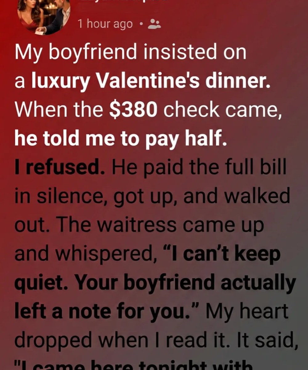 As I prepared to leave, the waitress approached and handed me a folded note from him. In it, he explained that the evening wasn’t just about dinner—it was about seeing how we handled discomfort and unexpected moments together. He wanted to understand whether we could communicate honestly without becoming defensive or hostile, emphasizing that relationships are built not only in perfect moments, but in disagreements and awkward pauses. Standing outside in the cool February air, I realized the night had tested not our finances, but our ability to navigate tension together—and perhaps that lesson mattered more than the bill itself. READ MORE BELOW