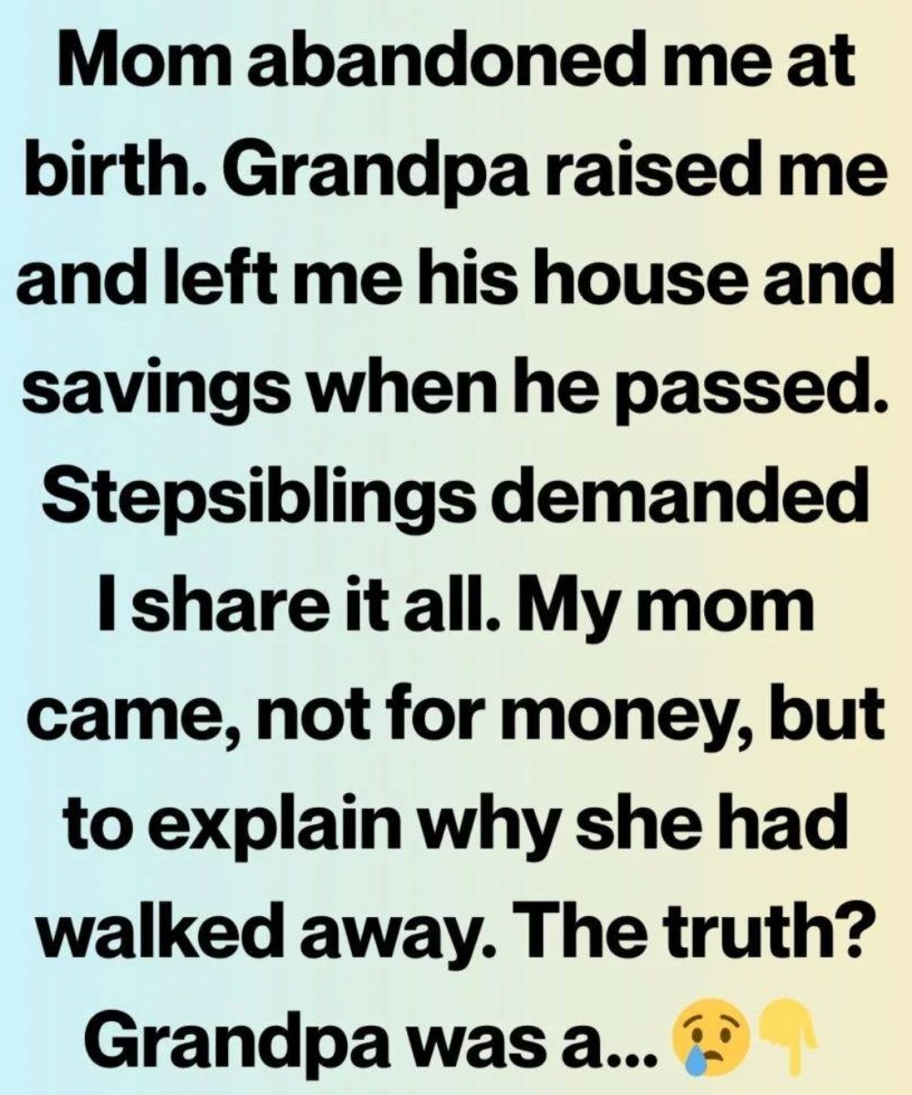 But soon after the will was read, everything changed. My phone filled with angry messages from step-siblings I barely knew, demanding that I share the inheritance. I ignored them all until my mom finally reached out. Unlike the others, she didn’t immediately ask for money. Instead, she told me that the story I had grown up believing wasn’t the whole truth. According to her, my parents didn’t abandon me at all—my grandfather had convinced them they weren’t ready to raise a child and asked to take care of me temporarily. She claimed that when she later tried to take me back, he refused and even went to court to make the arrangement permanent.