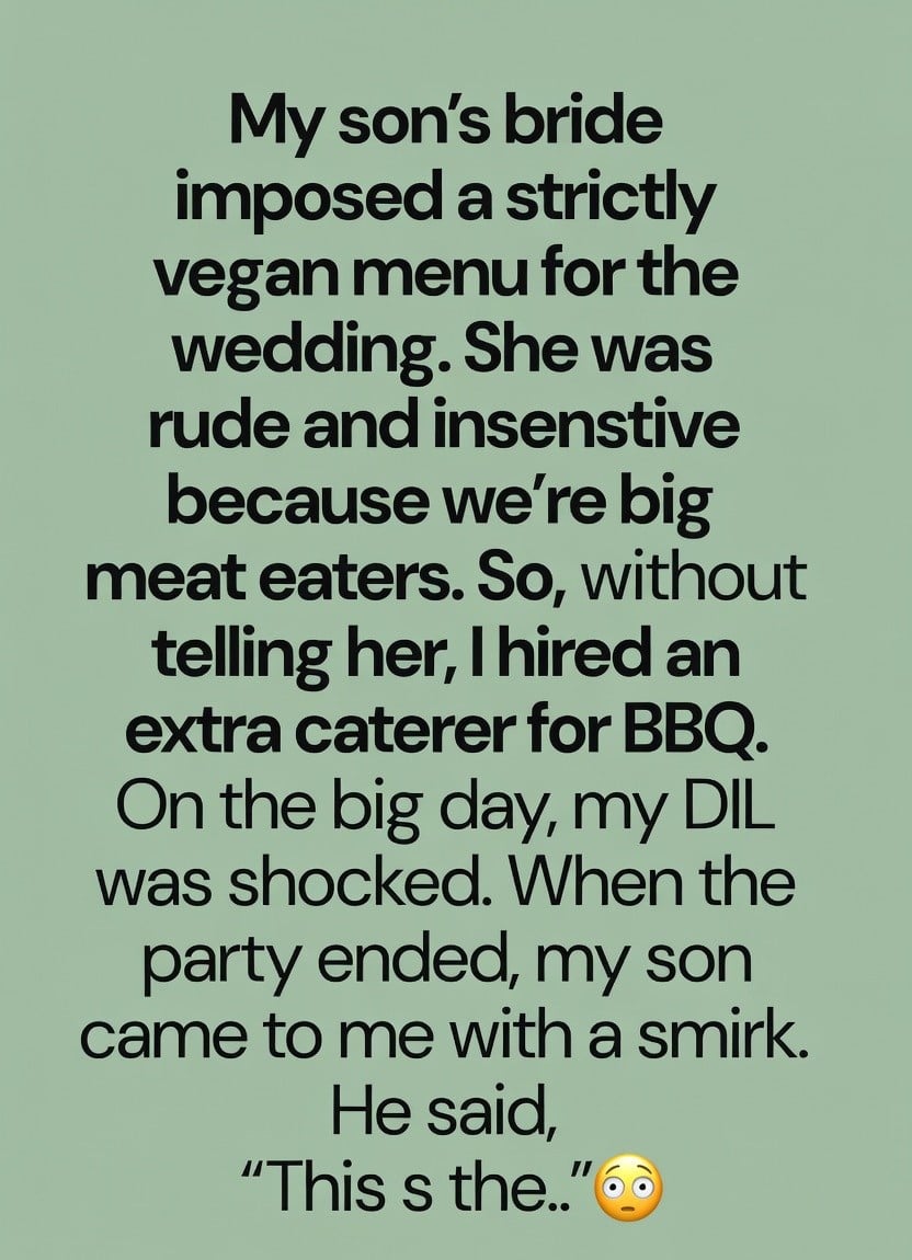 My son’s bride planned a beautiful wedding with a strictly vegan menu, something she cared deeply about. While I respected her lifestyle and the effort she put into the celebration, there wasn’t much room for compromise. My family, who have always loved traditional barbecue gatherings, quietly felt that a piece of our family culture was missing from the event.