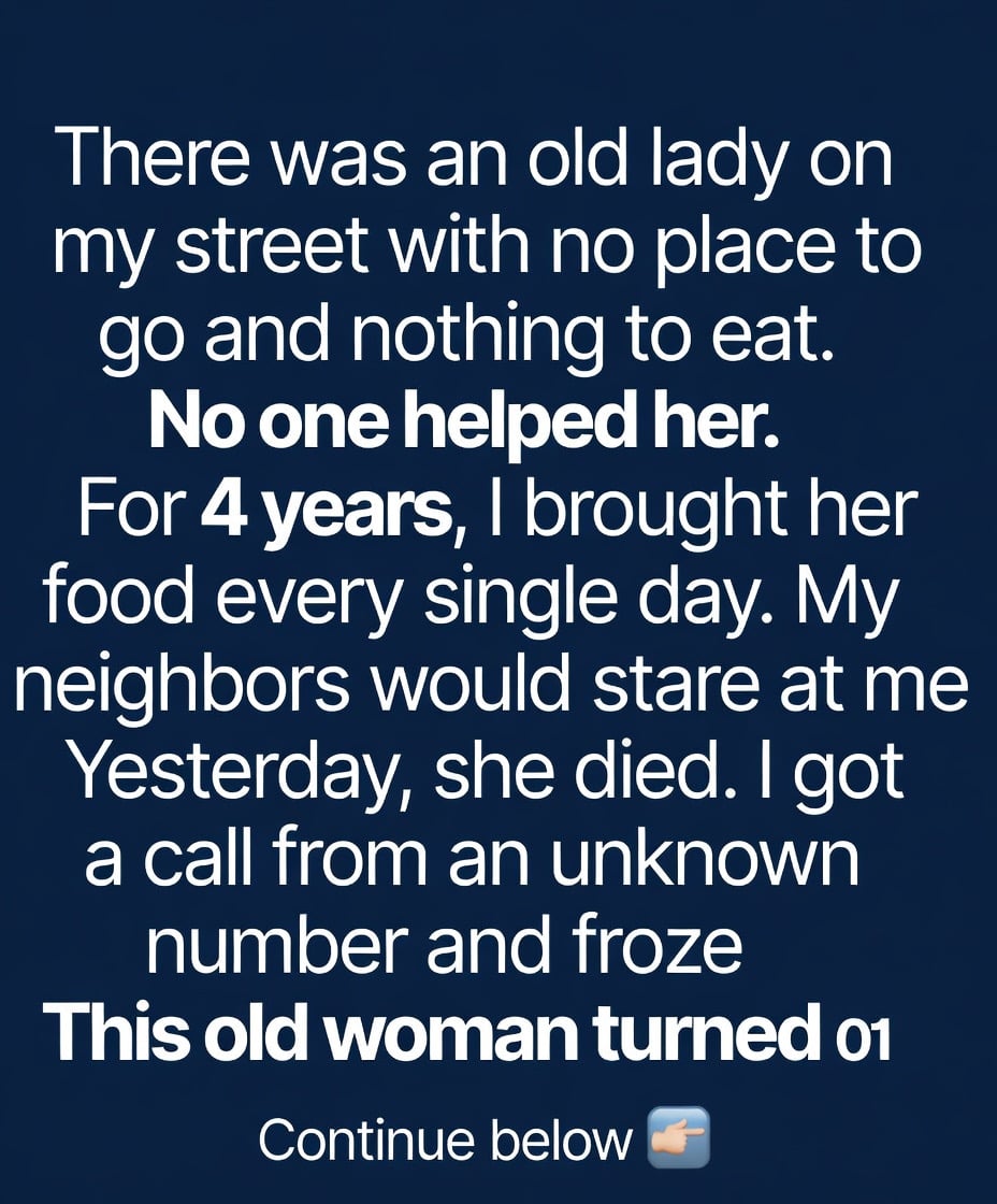 I was just her neighbor, living an ordinary life filled with work and errands. Yet each time I saw her sitting there alone, something in me stirred. One day I brought her a simple plate of leftovers. She thanked me quietly, and the next day I did the same. What began as a small gesture slowly turned into a routine. For four years, I brought her a meal almost every day—not because she asked for it, and not because I expected anything in return, but because it felt like the right thing to do.