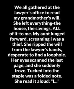 When her grandmother’s will was read, Ellie was stunned to learn she had inherited everything. Her Aunt Trish erupted in anger, accusing her of manipulation, but a note attached to the will made it clear the decision was intentional. Ellie had never expected anything—she had simply been the granddaughter who visited weekly, helped with chores, and kept her grandmother company. While others assumed the house would be theirs, she had only given time and care.