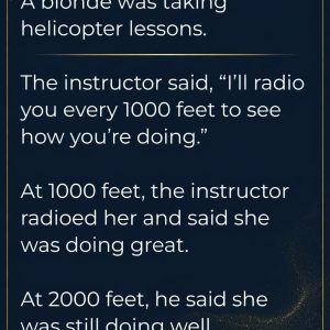 A humorous story begins with a blonde taking helicopter lessons. Her instructor checks in with her at every 1,000 feet, and everything seems to be going perfectly…
