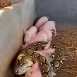 A shocking video is making waves online after a massive python was found coiled tightly around helpless piglets inside a farm enclosure. As the animals squeal and-…