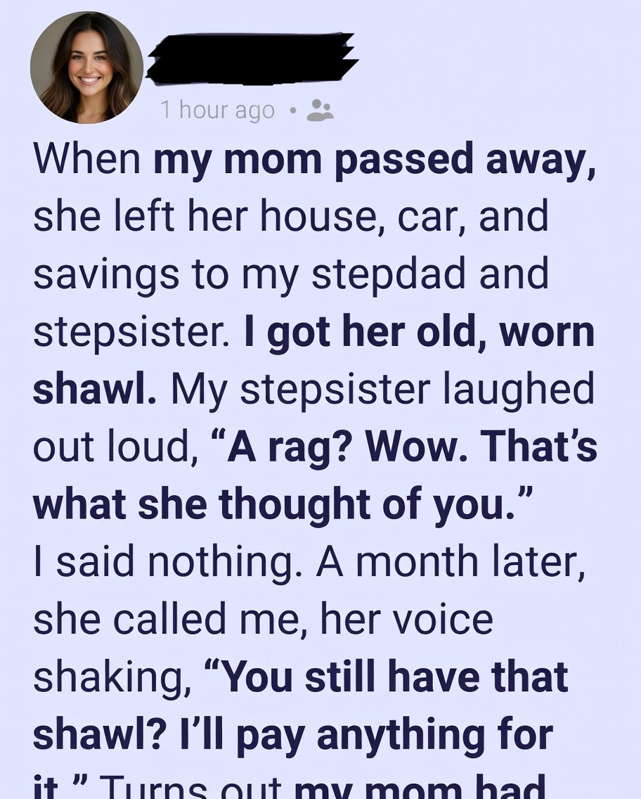 A month later, my phone rang—and everything changed. Lila’s voice was shaking as she begged to buy the shawl from me, offering any amount of money. Confused, I listened as she revealed the truth the lawyer had accidentally told her. My grandmother hadn’t just been wealthy—she had been hiding a fortune. And before she died, she gave my mom that same shawl, calling it “precious.” What no one knew was the real condition: whoever held the shawl would inherit everything. No announcements. No second chances. Just one quiet decision.