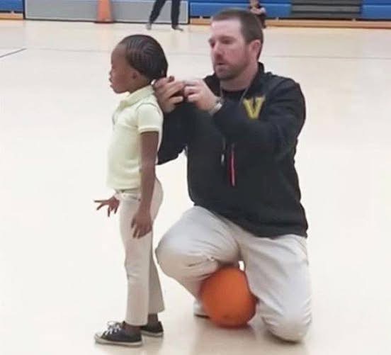 When kindergartener Kristen Paulk asked him to fix her hair, Coach Oliver knelt on a basketball and tied her ponytail, not realizing another teacher was recording the moment. The video went viral, touching hearts online and even making it to Good Morning America.