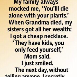 I’m 42 and childfree. My family always mocked me, “You’ll die alone with your plants.” When Grandma died, my sisters got all her wealth; I got a…