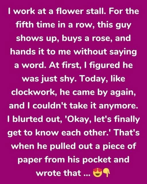 I work at a flower stall. For the fifth time in a row, this guy shows up, buys a rose, and hands it to me without saying a word. At first, I figured he was just shy. Today, like clockwork, he came by again, and I couldn’t take it anymore. I blurted out, ’Okay, let’s finally get to know each other.’ That’s when he pulled out a piece of paper from his pocket and wrote that he’s deaf and mute, and he simply enjoys seeing me smile.