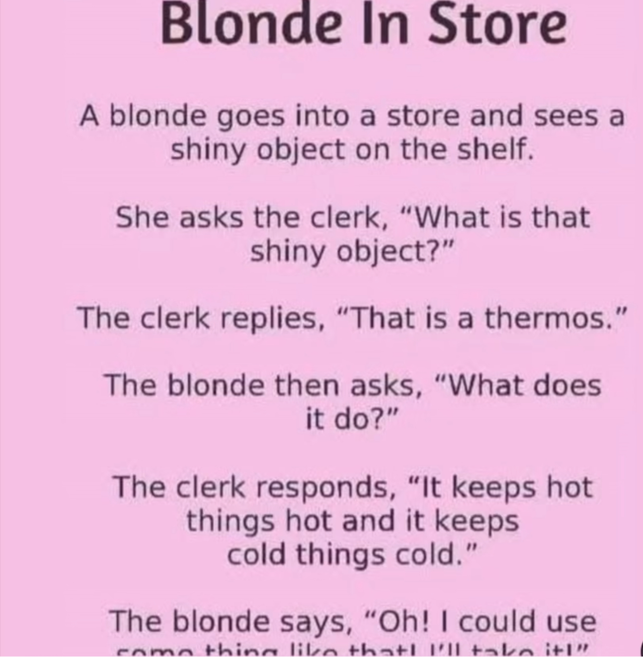 The clerk smiles politely. “That’s a thermos.” She tilts her head. “A thermos? What does it do?” “It keeps hot things hot and cold things cold.” Her eyes widen with excitement. “Wow! That sounds amazing. I definitely need something like that!” She buys it on the spot. The next morning,