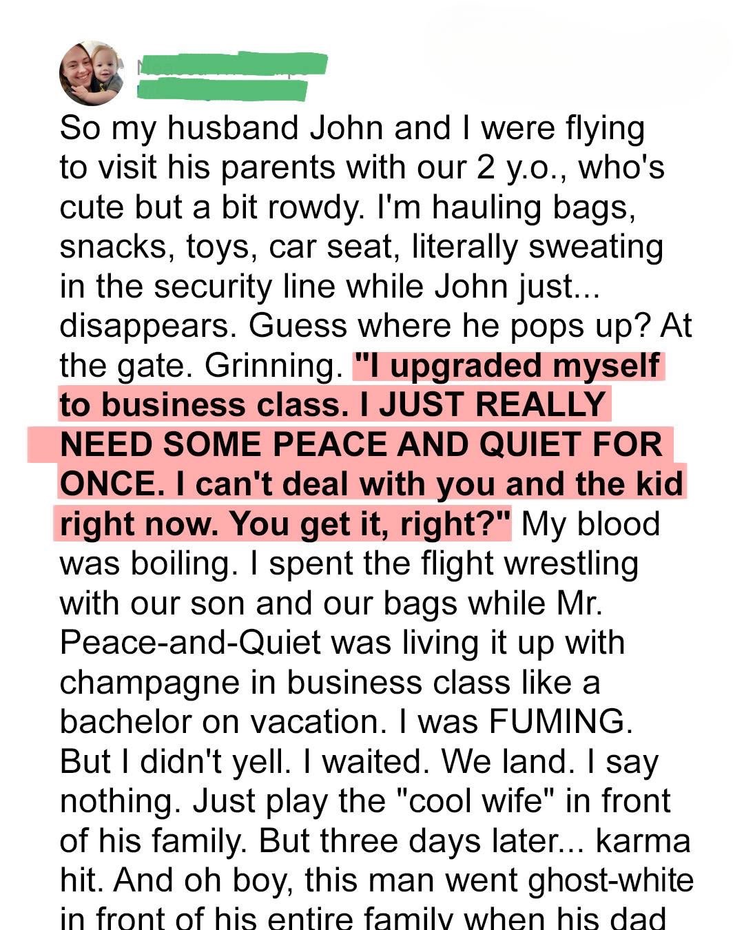When Claire and her husband, John, boarded a long flight with their two-year-old son, Ethan, she expected support not abandonment. But John had other plans. As Claire struggled with a fussy toddler, juggling snacks and toys alone in economy class, she was stunned to discover John had upgraded himself to Business Class for a “much-needed…